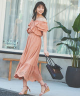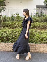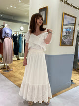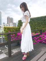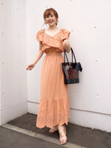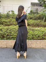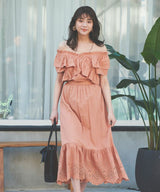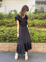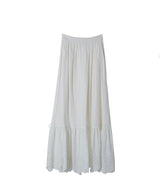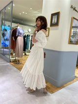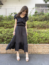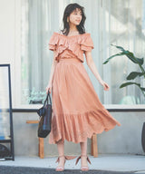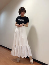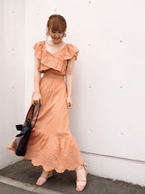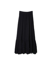 A gorgeous skirt with a silhouette that has a feeling of falling from the waist to the switch and a volume change by switching the hem, add embroidery to the hem.