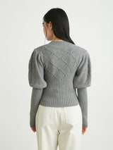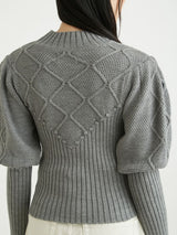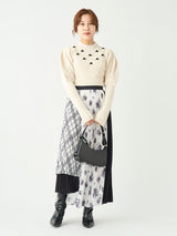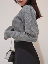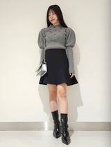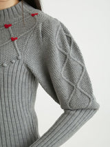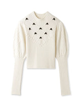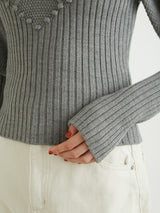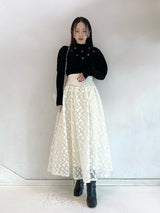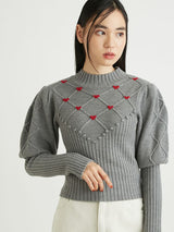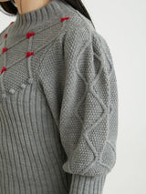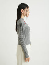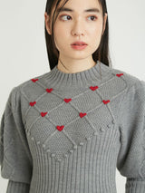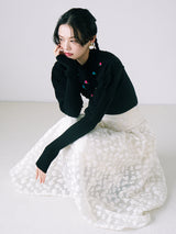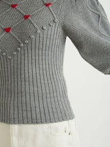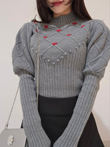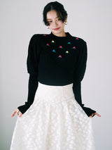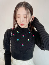 Retro design knit with motif embroidery on the front. Small roses are hand-embroidered on the white and black, and red hearts are hand-embroidered on the gray. The knitted fabric has a nostalgic feel, and the casual popcorn adds a touch of loveliness. The position of the knitted fabric under the bust has been carefully chosen to create a slender look.
