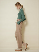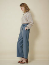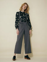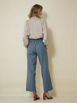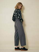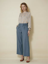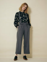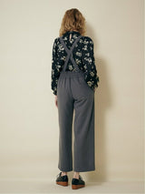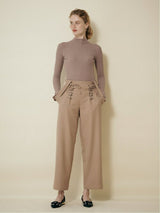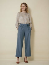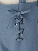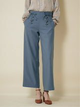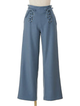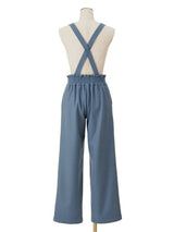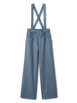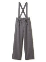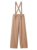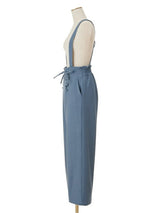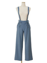 Pants accented with lace-up ribbons. The suspenders are removable. Wear it with the zipper on the left side. Rubber specifications behind the waist. With both side pockets. With lining.