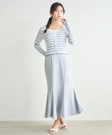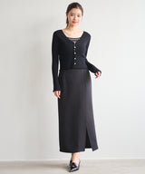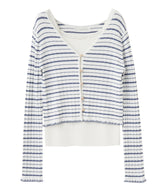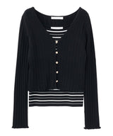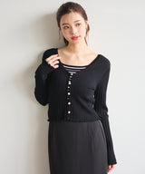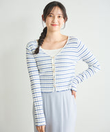 This ensemble of a cardigan and knit pullover creates a sophisticated, feminine look. The cardigan uses an expressive knit fabric that combines fine cables and eyelets. Sparkling pearl-like buttons on the front add a touch of glamour. The inner pullover uses ribbing that gently hugs the body line. The square neckline flatters the décolleté and enhances femininity. Available in four colors: off-white x blue and pink x burgundy, the cardigan features a striped pattern and the pullover is solid. Blue-gray and black feature a striped inner and a solid cardigan. Wearing the set makes styling a breeze, and the pieces are also versatile enough to mix and match on their own. The inner pullover is machine washable, making it easy to care for at home.