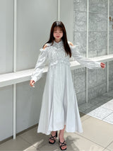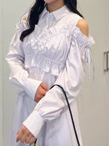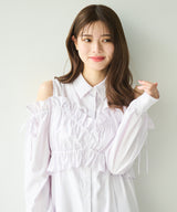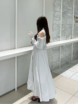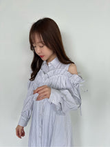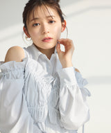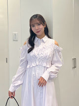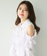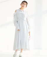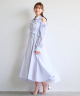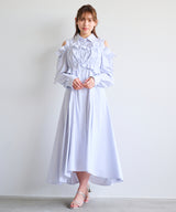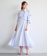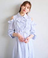 A gorgeous shirt dress that easily creates a trendy layered style. The design looks like a layered bustier with frill details, adding a stylish impression to a neat shirt dress. It is an eye-catching item that shows just the right amount of skin and has a feminine mood. The fine pitch and refreshing striped pattern will enliven the mood of the season. The raised front hem that creates a light feel on your feet is also a key point.