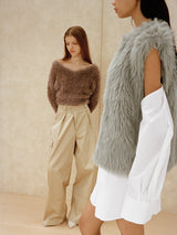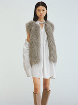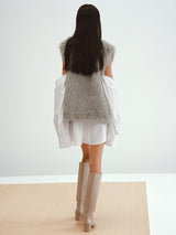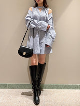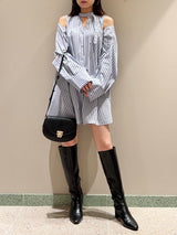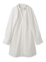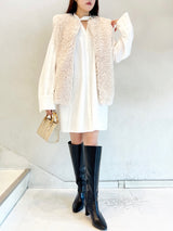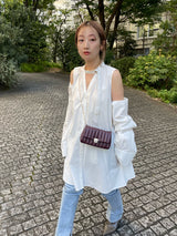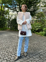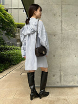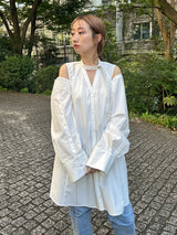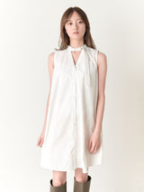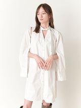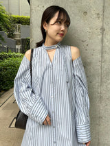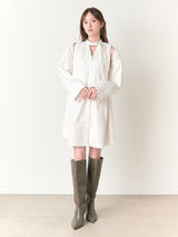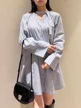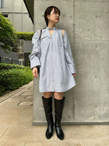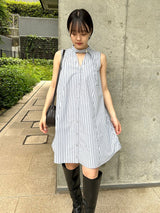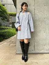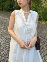 A 2-piece shirt mini dress that combines a long-sleeved bolero and a sleeveless dress. The collar of the dress has an eye-catching design with trendy buttons. The sleeves of the bolero have slits, so you can open the buttons to add a loose look. It is a versatile item that can be arranged in various ways depending on your mood and styling, expanding the range of coordination.
