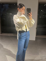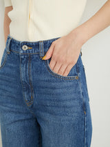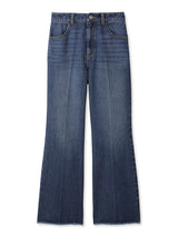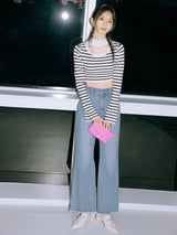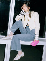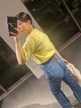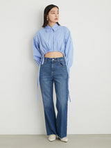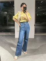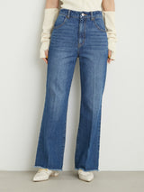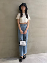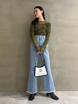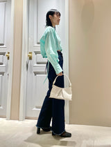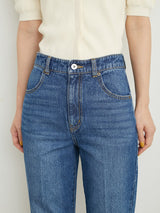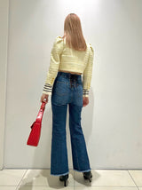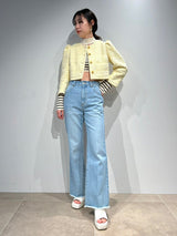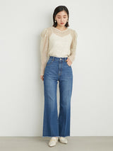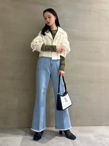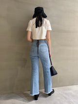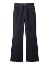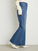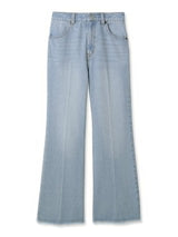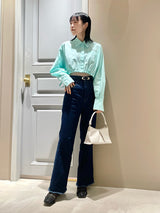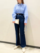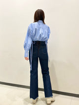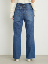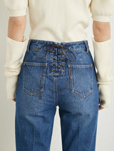 Denim pants with a lace-up design that sublimates a casual item into a feminine look. The semi-flared silhouette and center press processing make the leg line look beautiful regardless of the wearer's body type. The back waist has a lace-up design that allows for some size adjustment. Since the silhouette is beautiful, the hem is intentionally cut off to give it a vintage-like finish.