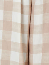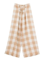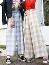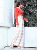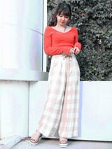 Wide trousers with a large gingham check this year. The deep rise and lace-up design make it easy to decide on the tops and cover the waist and hips you care about.