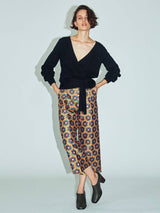The original pants with shiny jacquard cloth containing thin cotton. It is a slightly thick silhouette with tuck. Cropped length makes it compatible with boots and flat shoes