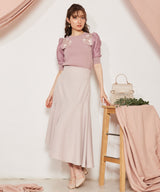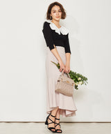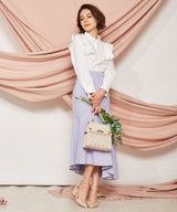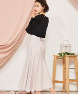 A soft mermaid skirt with a simple yet dynamic silhouette that switches around the hips and diagonally takes the hemline.